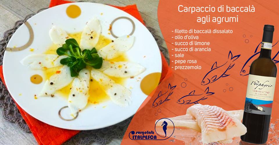 Ingredienti: filetto di baccalà dissalato olio d'oliva succo di limone succo di arancia sale pepe rosa prezzemolo Preparazione: Prendete del filetto di baccalà e tagliatelo a fettine sottili. Appoggiatele su un piatto e aggiungete del pepe rosa. Spremete mezzo limone, mezza arancia e mescolate il succo all'olio d’oliva. A questo punto aggiungete un pizzico di sale e di prezzemolo. Versate la salsa di agrumi sul carpaccio di baccalà e lasciatelo marinare per almeno un’ora. In breve tempo avrete un antipasto gustoso e facile da preparare. Vi raccomandiamo l'abbinamento con un fresco Porphyrio Vermentino di Gallura